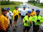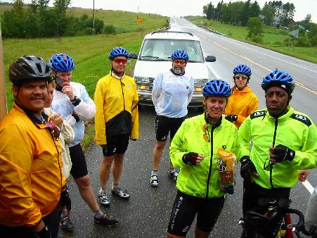 Roadside Snack BreakOne highlight for almost everyone was at about 40 miles out when we went by a huge field of sunflowers. We had seen it on our drive up to International Falls, and had made a point then that this would be a photo stopping point. Most everyone thus went out and stood in the field of sunflowers and had a rather surreal photo taken. It was a nice break, and we also had an impromptu snack break along the side of the road (during a brief moment of sunshine, which was the only sun that we saw during the entire ride). By the time we had reached our hotel, we had our team skills down pretty good. The support crew had gone ahead with just a few miles left to have the trailer ready for us, and had arranged for a way to get everything cleaned up from the rain and dirt sprayed all over us and our bikes. After an assembly line bike washing session (with a hotel provided garden hose), it was time to hit the room and a nice hot shower. Dry clothes never felt so good! :-)