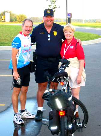 Wisconsin / Illinois LineToday's goal was to make it into Illinois, and attend a "Health Fair" being held in Rockford. We made it there in fine style, over beautiful rural roads and very light overcast with no wind. In other words, if you ever had to pick a day for riding, today was the day. And we are getting spoiled by the grand entrance we get to make lately. I understand that everything we are going to do in Illinois will have a police escort. They did it in style today, as they gave us a police escort, and even did Wisconsin one better by running their sirens as well as their lights. OK, so it may be the kid in all of us, but I know every rider again thought it was a seriously fun way to arrive at an event! :-) As for the event that was held in Rockford, we once more had lumps in our throats as we listened to some incredibly touching stories of people who have given so much in their time of sorrow. If anyone has any question about whether or not anything good goes on in this sometimes crazy world, believe me when I tell you that I have met some very wonderful people that would restore your faith in humanity in very short order.