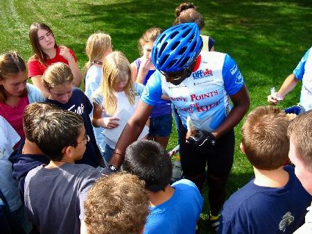 On a pretty normal Friday the 13th, our day went very well. We left our hotel in the western suburbs of Milwaukee at 7:00 AM, and arrived in Elkhorn, Wisconsin just a slight bit early. As we were taking a short break about a mile from our destination (We were waiting for all of the support vans to catch up to the team) we found ourselves near a middle school. As luck would have it, during the 10 minutes time we spent at that location, the school had a fire drill. All of a sudden we found ourselves surrounded by masses of little people, all very curious about the group of riders all dressed in matching outfits, and especially curious about our very cool bikes. ![]()